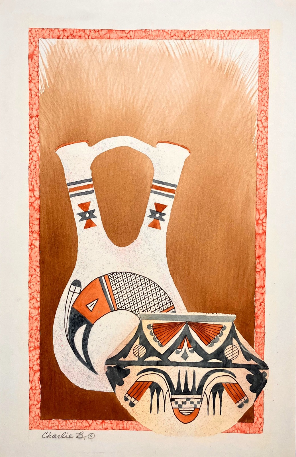 Back in the 90’s, C K Brothers owned an art gallery in Williams, AZ. While showcasing his contemporary Cowboy style and the work of others, the space lacked a Southwestern element that visitors often asked about. He searched for a developing artist with a contemporary flair, but came up empty. So he developed the style he was looking for, and Charlie B was born. He did not use the C K Brothers name with this decorative style. Since it was a huge departure from his main body of work, he did not want to confuse his collector base.